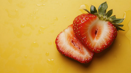 A sliced strawberry revealing its juicy core, placed on a vibrant yellow surface.