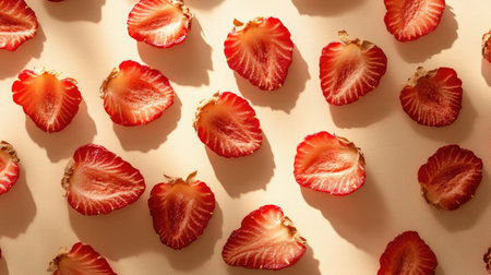 A visually striking arrangement of freshly sliced strawberries showcasing their vibrant red color and juicy texture, perfect for food photography and health-related themes.