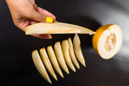 Female hand holding chunk of yellow melon in focus and rest of melon chopped on black background.