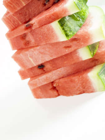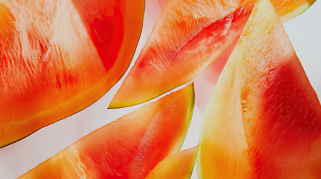 Juicy, colorful watermelon slices and cubes arranged as a refreshing background, showcasing the vibrant red fruit and green rind