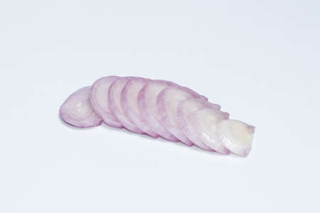 Whole Red onion Sliced in different ways and arranging. Top view Garnish and food ingredients on isolated white background.