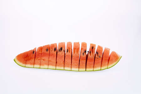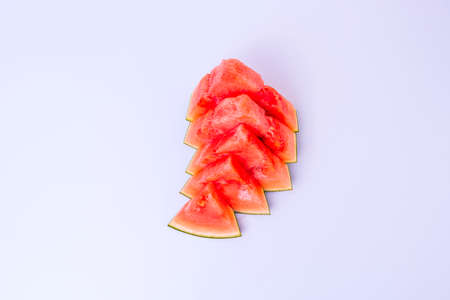 Ragged triangular portions of red seedless watermelon on pastel blue color background