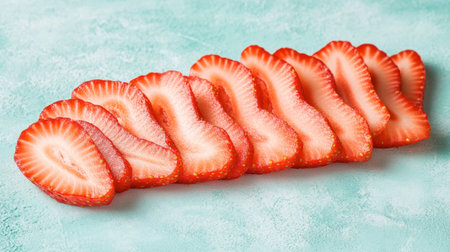 A stunning arrangement of freshly sliced strawberries displayed on a vibrant blue background. Perfect for food photography, healthy recipes, or summer-themed projects.