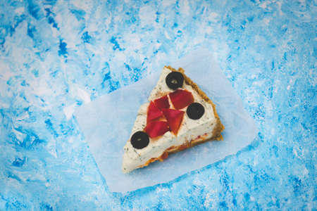 Homemade cheesecake slices on blue shades squares. Tasty dessert collage. Pieces of cheese cake on blue background. Above view of cake slices.