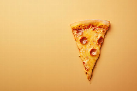 This visually appealing pizza slice features vibrant toppings and dripping cheese on a clean, minimalist background, perfect for food presentations.