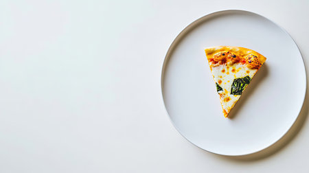 A delectable slice of cheese pizza topped with fresh spinach rests on a clean white plate, presenting a perfect blend of flavors ideal for any meal or gathering.