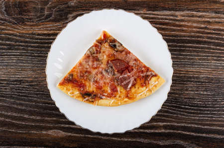 One piece of baked pizza with sausage, tomato, cheese in white plate on dark wooden table. Top view