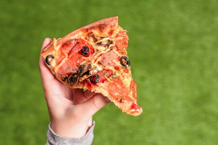 A man holds a slice of pizza in his hands. Fast food in the fresh air