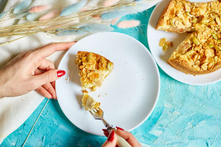 Hands of unrecognizable woman eat a piece of apple or pear pie with caramel nuts on blue table with sunlight, copy space, top view.