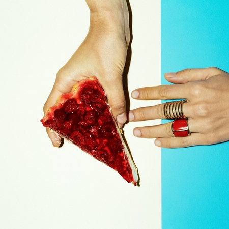 Mousse cake in a woman's hand with raspberries on a red background, studio photo close-up.