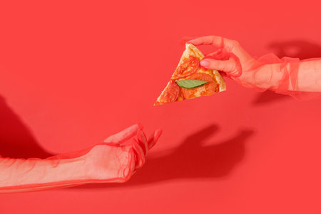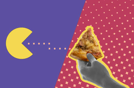 A hand holds a piece of pizza on a pink background.Pacman eats pizza. Digital collage modern art.