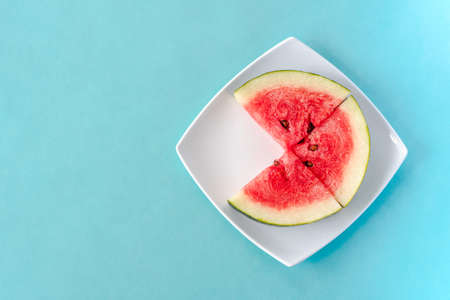 Water melon slices on a plate on blue background. Juicy fresh tasty summer dessert. Top view with copyspace. Stock photo