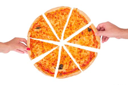 A hands of a man and a woman take slices of pizza, top view. Sliced pizza with mozzarella, bocconcini and basil leaves or pizza margherita, isolated on white background with clipping path