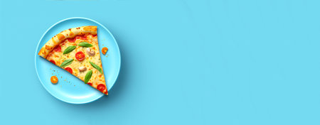 Creative minimal composition of a single pizza slice topped with tomato and basil on a vibrant blue background. Includes copy space, making it ideal for banners, food promotions.