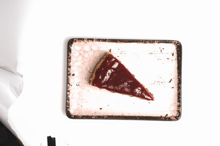 Top view of slice of macadamia cheesecake on white dish or plate with copy space on right. Fat lay of Sweet dessert and Homemade food at cafe shop.