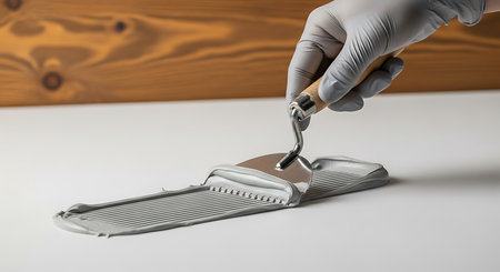 Modern grater on beige background, top view