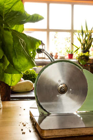 Bread cutter on a table with fresh organic products