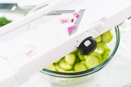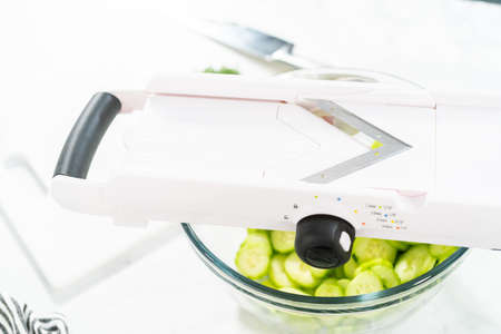 Slicing vegetables on slicer to make summer cucumber salad.