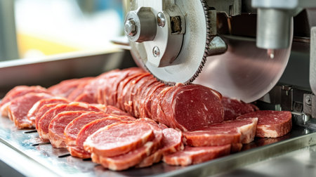 Close-up view of a butcher skillfully operating a meat slicer, creating precise cuts of red meat for diverse culinary applications