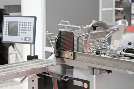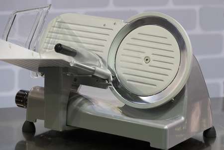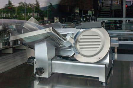 slicer. Slicer in a restaurant. Sale of equipment for cutting products. Cutting food into small pieces. Device for cutting. Modern equipment for the restaurant. Appliances in the kitchen cafe