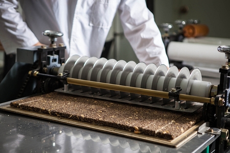 Sliced white bread in a cutting machine