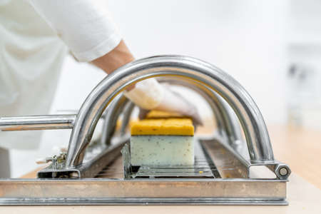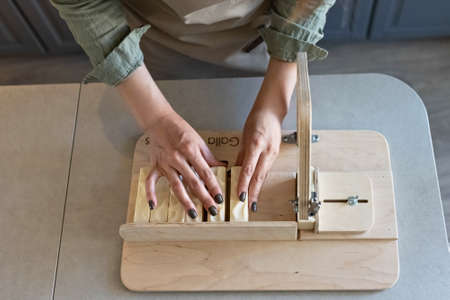 A woman makes handmade natural soap. The finished soap is cut into pieces using special machine. Home spa. Small business.
