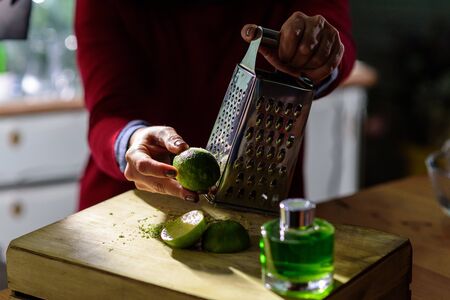 Close-up image of female cafe worker cutting green peel oranges for making juice