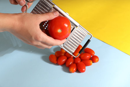 A sleek kitchen slicer designed for effortless fruit and vegetable preparation, showcasing vibrant produce and enhancing meal presentation and creativity.
