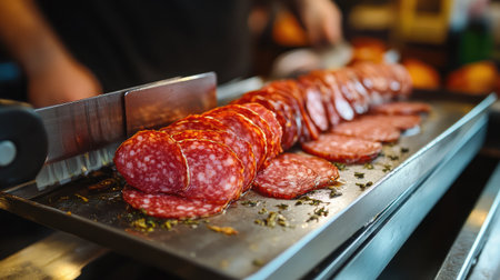 Automated slicer producing thin cuts of salami onto a metal tray in motion