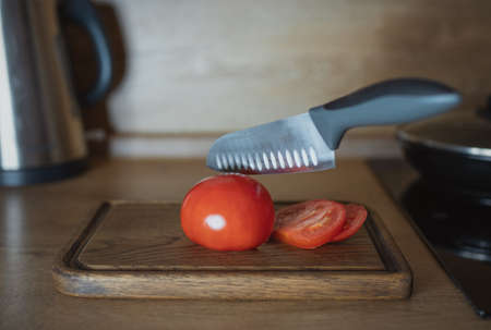 Sliced in half tomato placed next to a knife on black stone background