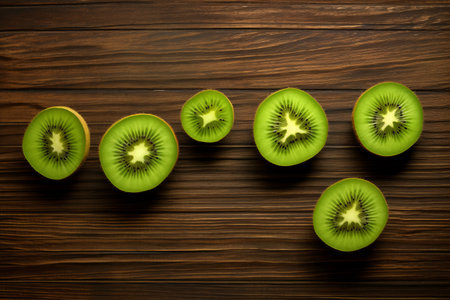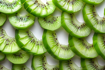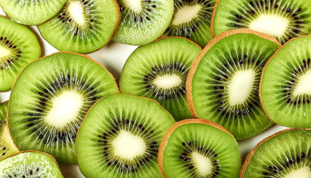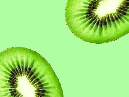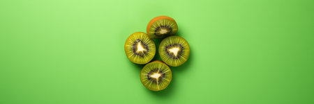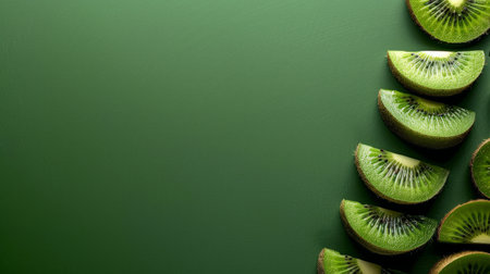 Freshly cut kiwi slices arranged on a vibrant green background showcasing the fruits texture and color