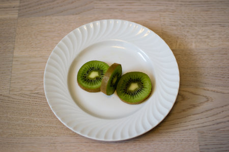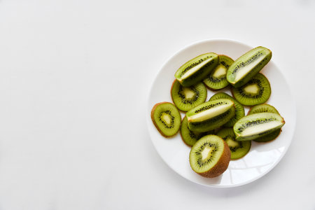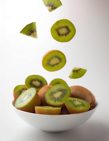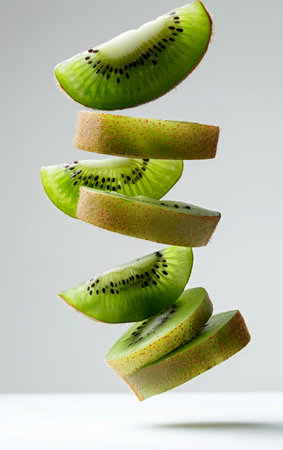 Slices of kiwi fruit levitating against a minimalist white backdrop, showcasing a vibrant and refreshing visual. Juicy green segments create a lively and healthy atmosphere