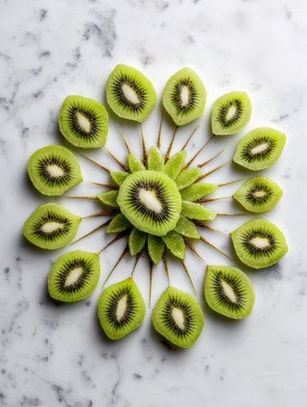 Sliced kiwi pieces are beautifully arranged to form a flower mandala pattern on a smooth marble background, creating a vibrant and artistic display.