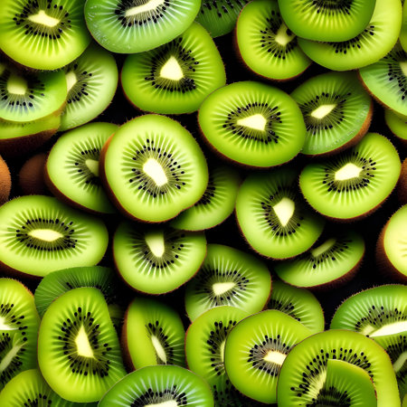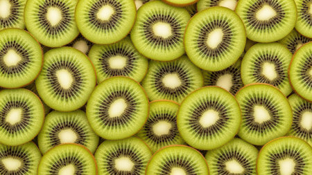 Freshly sliced green kiwi pieces arranged in a repeating pattern, their vibrant color and texture. the slices reveal the seeds and juicy flesh, making it an ideal image for healthy food themes, natural backgrounds, or design elements for print, cards, and posters. Generative AI