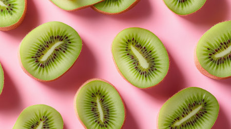 A regular pattern of vibrant kiwi slices with soft shadows arranged on a pastel pink background, creating a fresh and playful visual.
