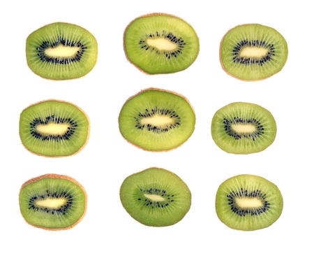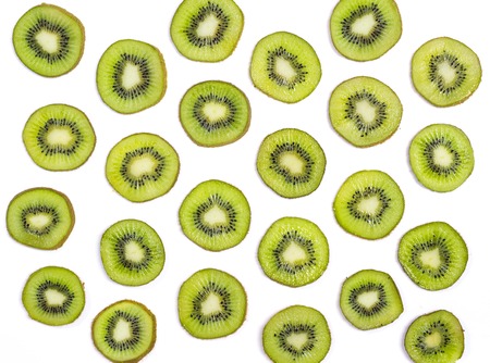 Colorful fruit pattern of fresh green slices of kiwi isolated on white background, top view
