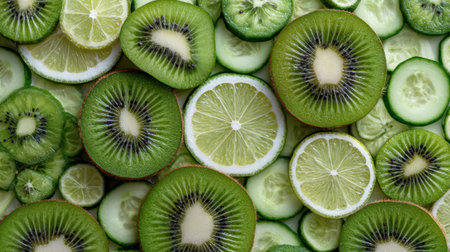 Fresh sliced green fruits and vegetables including kiwi, lime, and cucumber arranged in vibrant pattern, showcasing healthy organic produce for detox diet and wellness nutrition concepts.