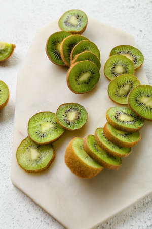 Juicy, tasty kiwi slices. They lie on a bright, light, colored background.