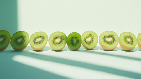 This image features a line of freshly sliced kiwis on a soft green background, showcasing their vibrant color, texture, and freshness, ideal for healthy eating concepts.
