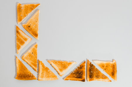 Neatly arranged toast bread pieces in a fan-like pattern, emphasizing their crisp texture on a white background