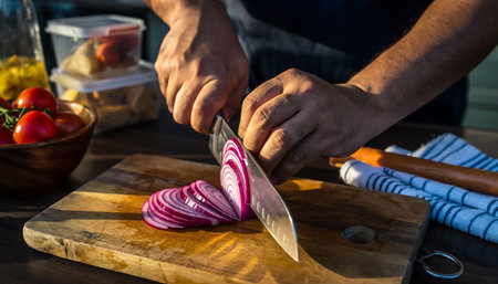 Close-up shot of hands expertly slicing red onions on a wooden board, with fresh tomatoes and other ingredients in the background, highlighting the process of meal preparation.