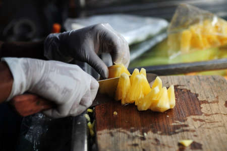 Close-up on man's hands slicing fresh pineapple