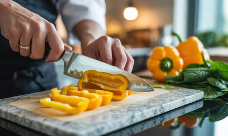 Chef hands precisely slicing a vibrant yellow bell pepper into strips on a granite cutting board, with other fresh vegetables in the background, preparing a healthy meal.