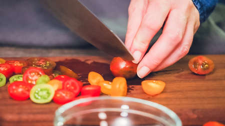 Step by step. Slicing heirloom cherry tomatoes on wood cutting board.
