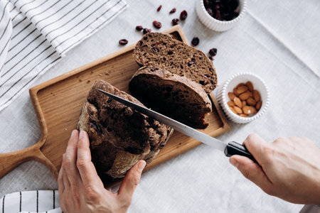 Fresh bread is being sliced with a sharp knife on a wooden cutting board. Red berries and almonds are placed around the bread, creating a cozy kitchen atmosphere.