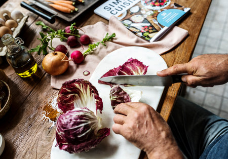 Caucasian man slicing bread while his wife is preparing a salad from vegetables in the kitchen
