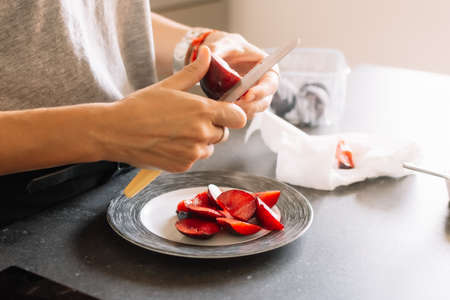 woman?s hand cutting into slices fresh red plum for breakfast on a plate. Close up of woman?s hand