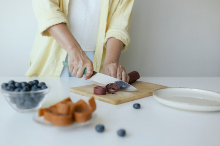 Caucasian woman preparing homemade fruit leather, slicing fresh fruit in her kitchen for a healthy snack. Part of a series on organic treats and natural living.