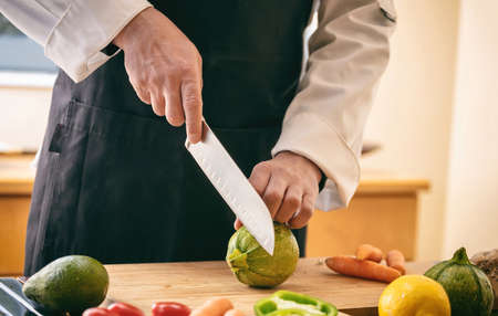 Chef is slicing fresh vegetable, Closeup of hands with knife cutting fresh organic vegetable