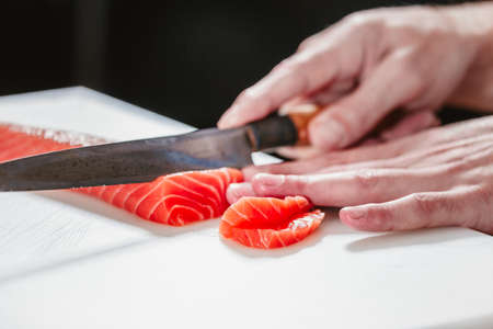 Cook cutting fresh salmon fillet